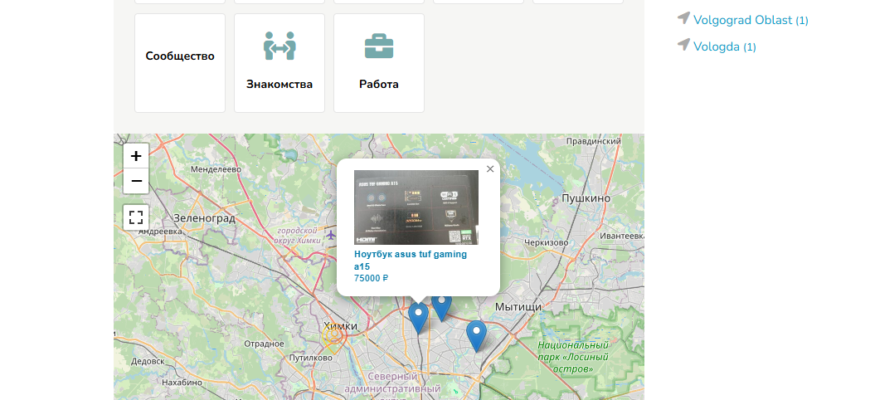 Интерактивная карта на главной странице с последними объявлениями